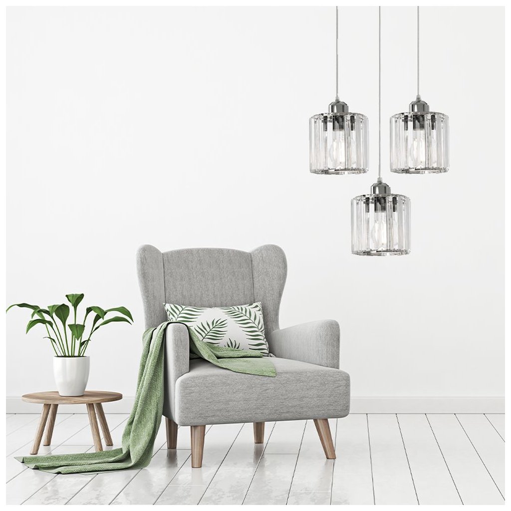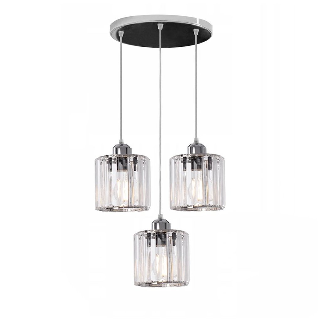 Lampa wykonana jest z metalu i szkła. Chromowany metal nadaje lampie wyjątkowego klimatu, které wpasuje się w niemal każdą aranżację. Prosty styl sprawia, że lampa pasować będzie do każdego pomieszczenia – zarówno do kuchyni, salonu czy przedpokoju. Klimatyczna lampa w stylu glamour Lampa posídá trzy klosze, przewody oraz metalową maskownica przy suficie.Wyposażona zůstala w nejpopularniejszy gwint przeznaczony do žarówki E27.Doplňkové parametry