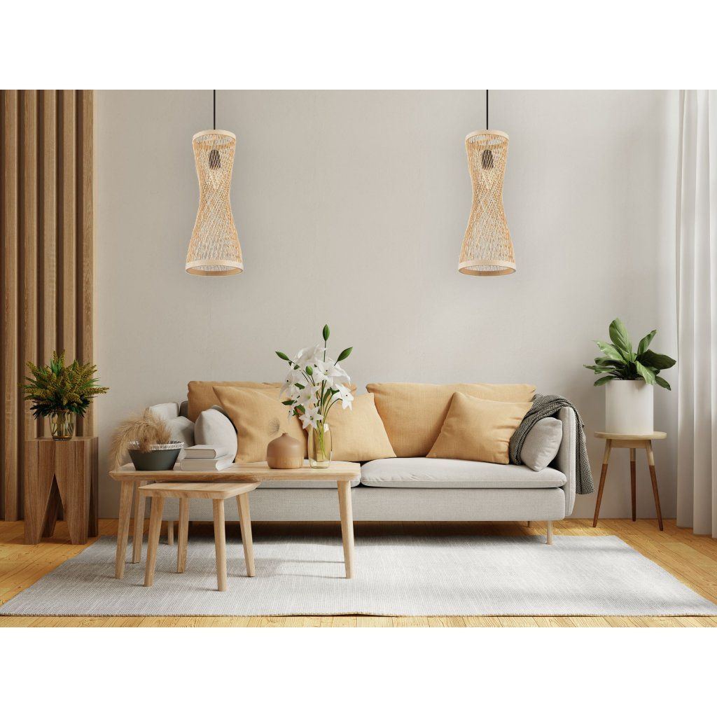 Závěsná lampa ve stylu boho je jedinečný dekorativní prvek, který kombinuje přírodní materiály a jemný design. Válcová lampa vyrobená ze dřeva a kovu poskytuje atmosférické a tlumené světlo. Díky svým kompaktním rozměrům: 42 cm na výšku a 14 cm na šířku, se skvěle hodí do jídelny, ložnice, chodby, kanceláře nebo dětského pokoje. Díky standardnímu závitu E27 je svítidlo kompatibilní se širokou škálou žárovek
