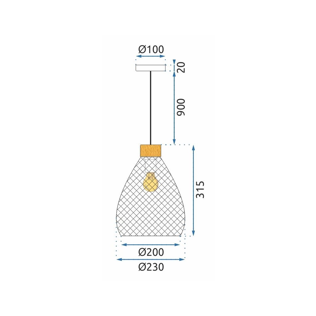 Lampa byla vyrobena ze skla v kombinaci se dřevem spolu s kovovou mřížkou na stropě. Lampa má nejoblíbenější vlákno určené pro žárovku E27. Délku kabelu lze nastavit podle místnosti nebo uspořádání.