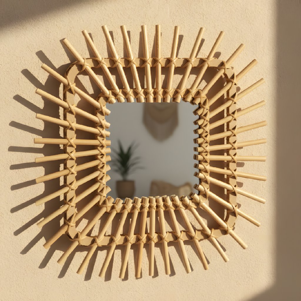 Zrcadlo je vyrobeno z vysoce kvalitního přírodního bambusu , který dodává krásnou a jedinečnou texturu. Každá kopie má svůj vlastní jedinečný charakter. Ideální do každé místnosti, obývacího pokoje, koupelny, kuchyně, haly, terasy nebo altánku. Kdekoli sníte o jedinečném stylu BOHO .